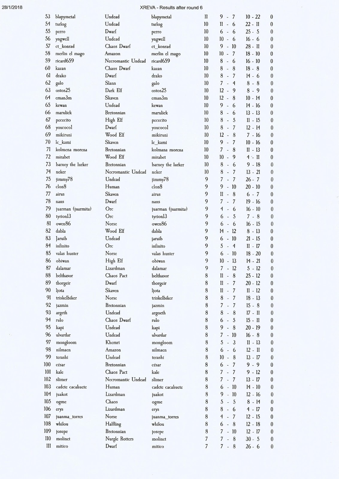 Ronda 4: Subí mesas y me tocó contra un almeriense Skaven que tenía un equipo chulísimo con peanas transparentes (NO recuerdo el nick, lo siento) Su rata Ogro me hizo polvo, encima era la más lista de la clase jaja, no pilló animal salvaje en ningún turno. Eso sí, me dió buenas lecciones de BB, muchas gracias por todo! Aprendí más con esta derrota que con cualquier victoria.